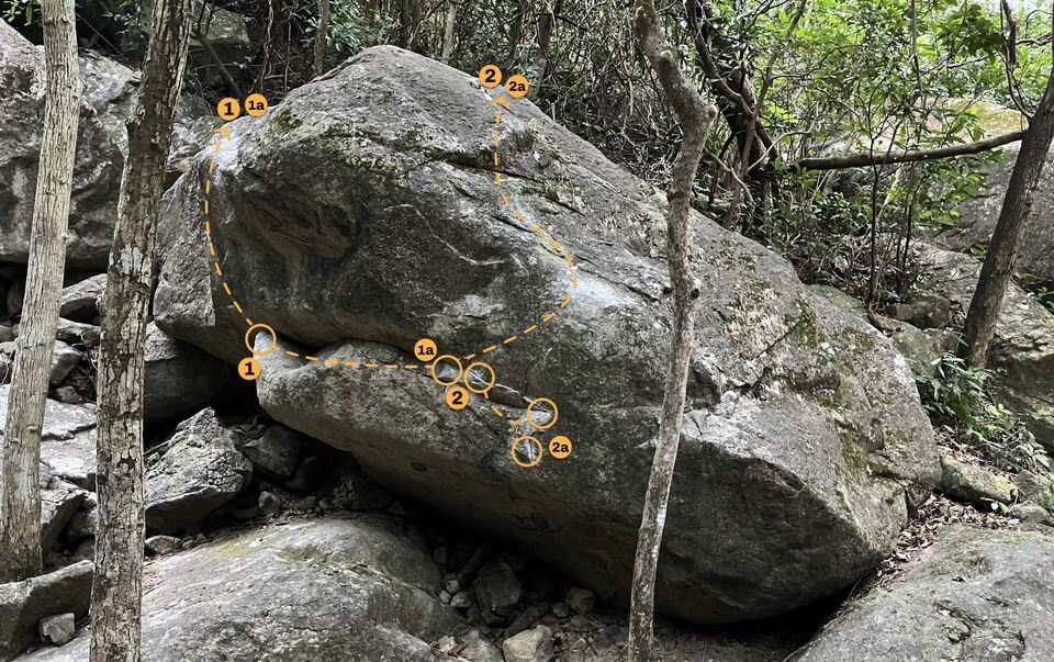 Start on two sloping crimps and get to the top by the slopers and crimps.