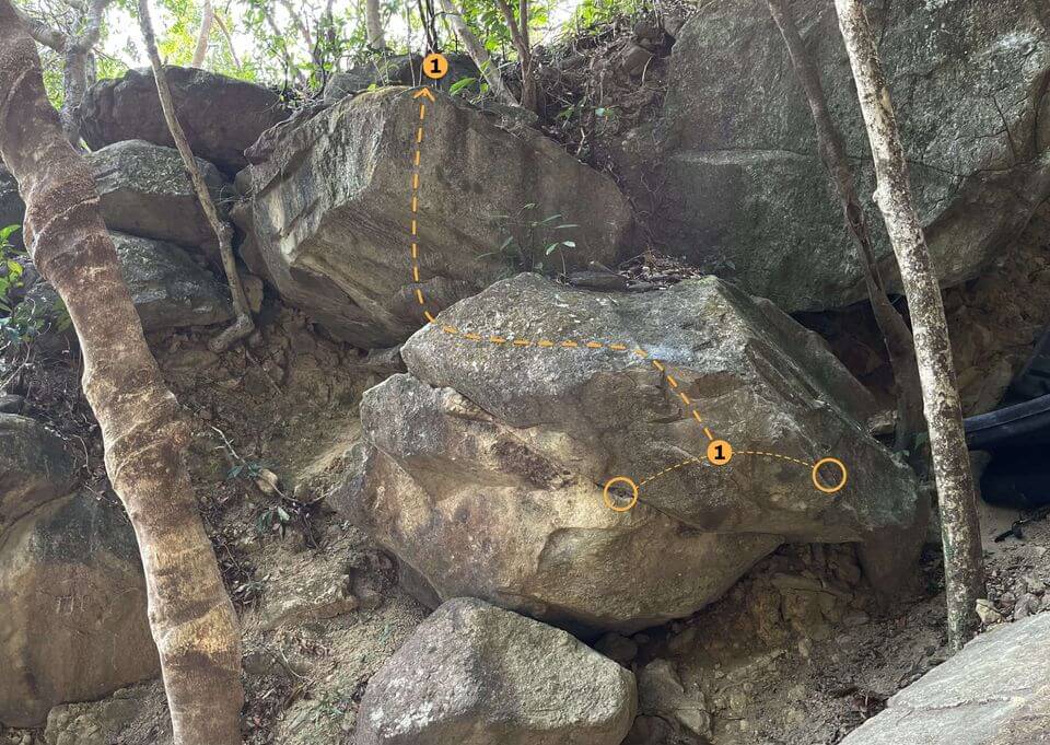 From crimps to the left of the small roof and on the right side of the roof, move up to the lip and traverse this left (including the stuff around the corner) until it is possible to reach the block above. Climb up and over this to finish.