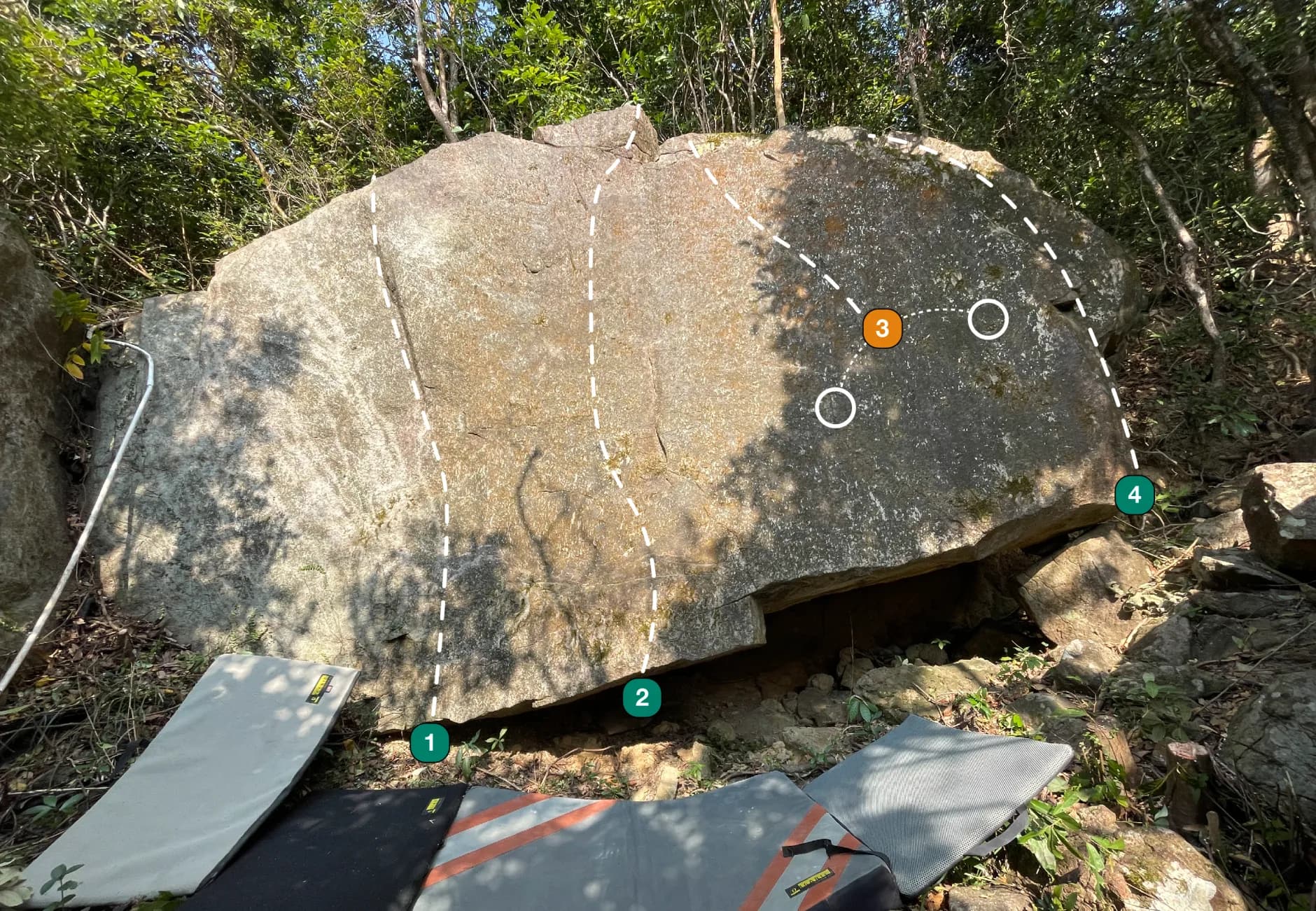 Use a thin flake to pull on to positive foot ledges in the middle of the face. Reach to a thin flake above (doing your best not to further snap the edge off this) and make a committing pull fo ledges just beneath the top of the bloc. Finish above.